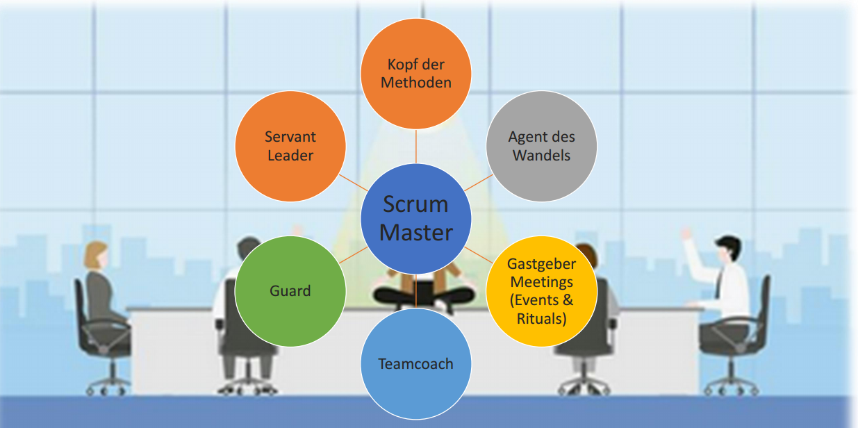 - Einladung aller Beteiligten zu Scrum-Events wie Sprint Planning, Sprint Reviews etc., diese Meetings planen, durchführen, moderieren, Sicherstellung dass jeder vom Team gehört hat